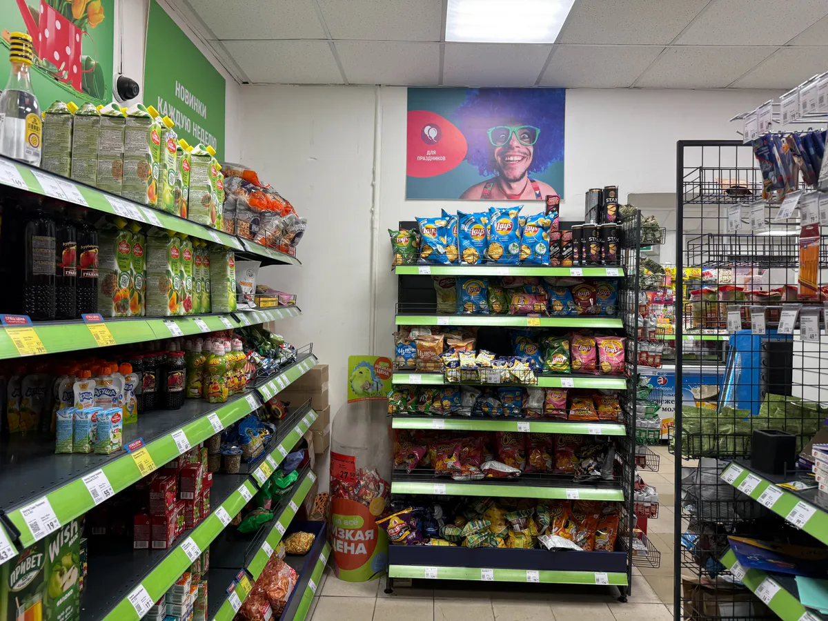 Магазин только открылся, поэтому внутри чисто, ярко и украшено шарами. График работы удобный: с 9:00 до 21:00, можно зайти после работы или в выходной. Есть несколько исправных камер хранения. Цветовая гамма — зелёные стены и такие же ценники. На входе сразу стоят морозильные лари с заморозкой и холодильники с молочной продукцией и напитками.