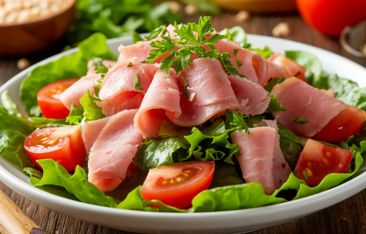 - Второй слой: Половина нарезанной ветчины.