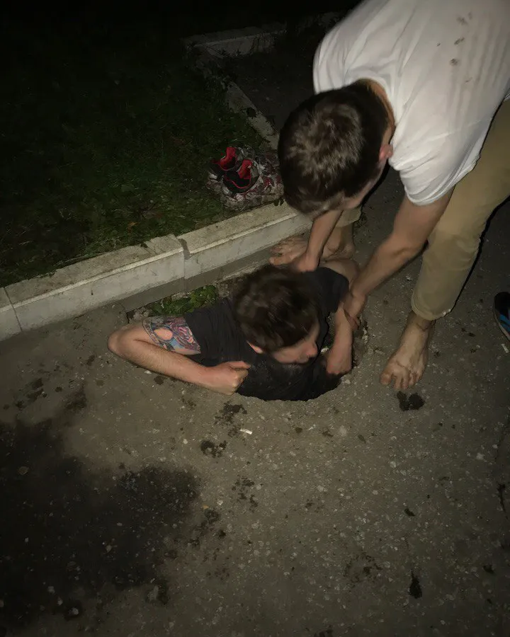 Очевидцы рассказывают, что рязанец долго не мог вылезти из ямы, потому что «зацепился ногой за железку» и застрял: