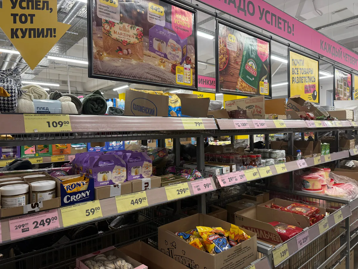 Продовольственный отдел привлекает экономных покупателей базовыми продуктами — гречневая крупа по 32 рубля за упаковку и куриный рулет по 249 рублей пользуются стабильным спросом. Молочная продукция представлена сливками по 99 рублей и напитком «Снежок» по 54 рубля. Для любителей домашних заготовок предлагают лечо по 169 рублей, а к чаю берут чипсы за 109 рублей и хрустящие крекеры по 69 рублей.