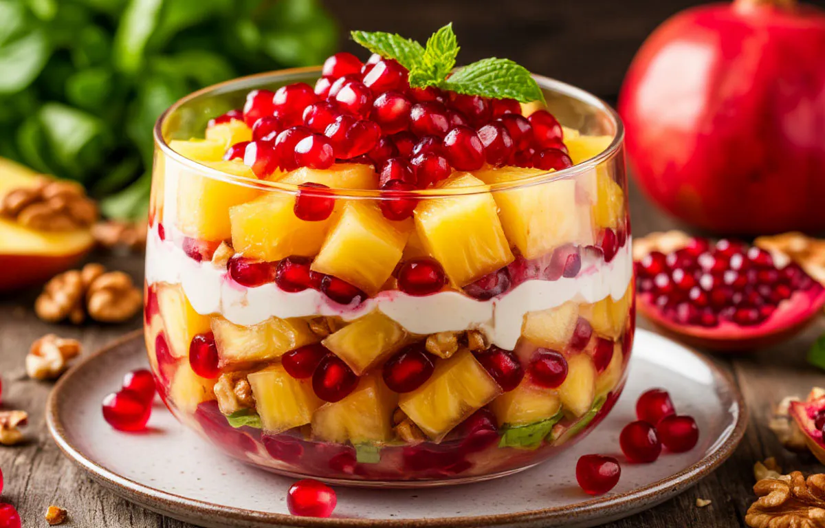 Праздничный салат с курицей, ананасами и грецкими орехами