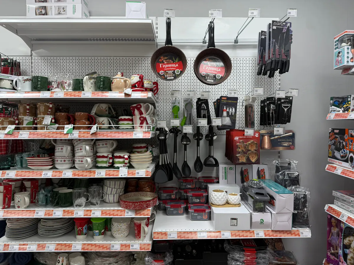 Хозтовары, косметика и канцелярия. В магазине есть всё для быта: от моющих средств и контейнеров до недорогой косметики (включая марку Sendo), расчёсок и канцелярских принадлежностей.
