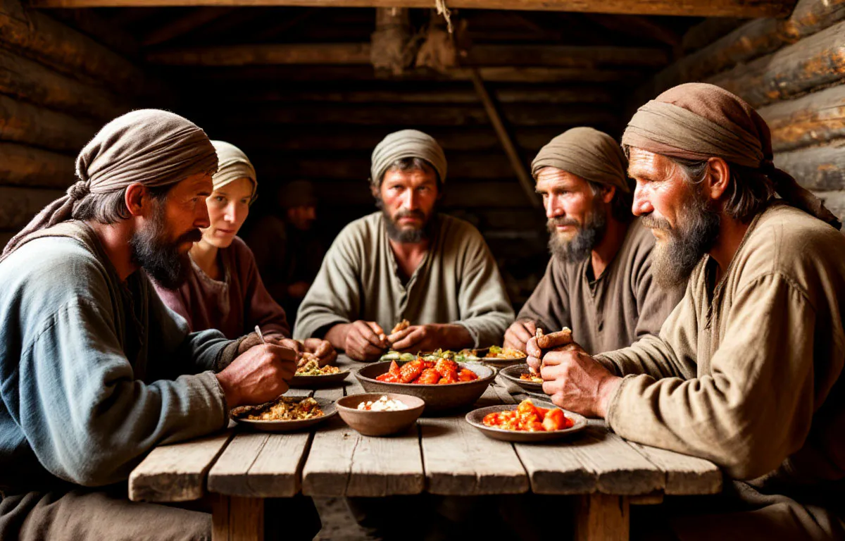 Рыба и мясо: Мясо ели нечасто, в основном по праздникам. Рыба была доступнее и играла огромную роль из-за длительных постов. Её солили, вялили, сушили и варили.