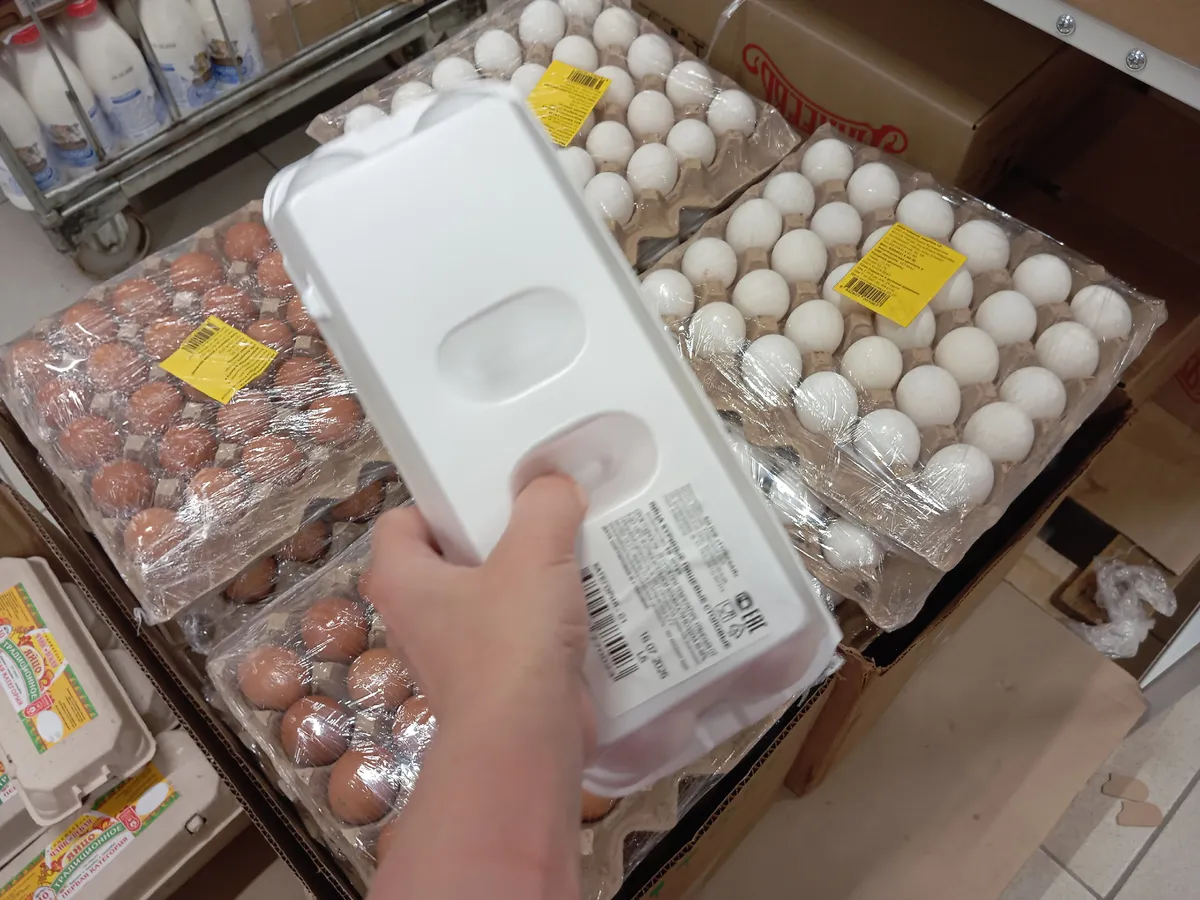 - Нарушение маркировки: Не указана категория яиц на упаковке, что является прямым нарушением ГОСТа. Фактический вес (58 г) соответствует только 1-й категории, а не отборной, при этом цена завышена.