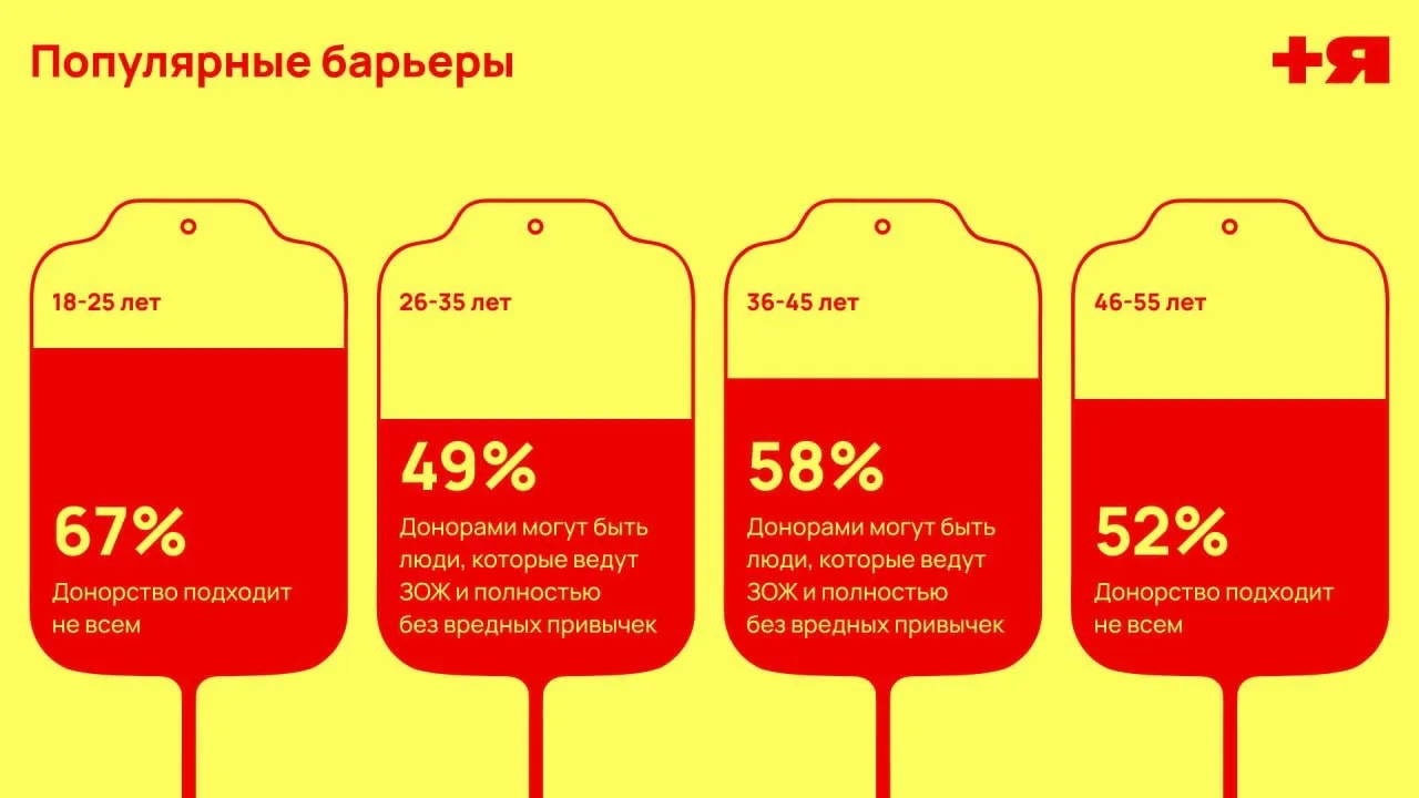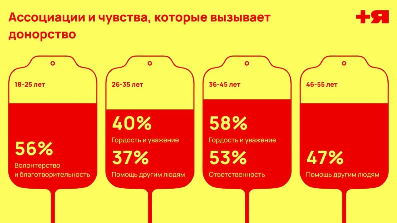 Еще одна особенность — растущий запрос людей на дополнительную информацию о процедуре. Почти половина (49%) участников разных возрастов не знают о регулярных донорских акциях. Это говорит не о том, что людям все равно, а о нехватке данных. К кроводаче относятся положительно, но она еще не стала привычной частью повседневной жизни. Для того, чтобы глубже погружать аудиторию в тему, на территории Рязанской области работают разные инициативы. Одна из них — просветительский проект о сдаче крови и плазмы «+Я». Его цель — говорить о донорстве крови и плазмы простым языком и развенчивать мифы.
