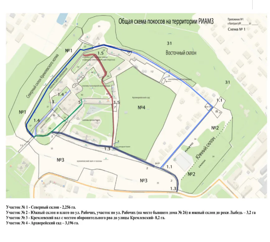 Участки разбили на шесть зон. Это газоны у Колокольни, у Успенского собора, у северной стены Спасского монастыря. Также Архиерейский двор, газон у Гостиницы Черни, участок у Дворца Олега с тыльной стороны и газоны вдоль дорог. Плюс территория хозяйственного двора и газон вдоль западной стены Спасского монастыря.