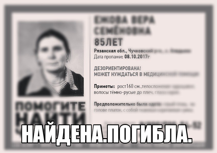 В группе поисково-спасательного отряда "Liza Alert Рязань" появилась информация, что пропавшая 8 октября рязанка Вера Семенова, погибла. Волонтеры начали искать 85-летнюю женщину 11 октября. Ранее сообщалось, что она дезориентирована и может нуждаться в медицинской помощи.