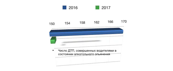 Количество ДТП с участием водителей ТС, находящихся в состоянии опьянения снизилось по сравнению с прошлым годом: в 2017 году – 151 ДТП, в которых 208 человек получили ранения, 30 - погибли, в прошлом – 168 ДТП, в которых 61 человек погиб и 218 - ранены.