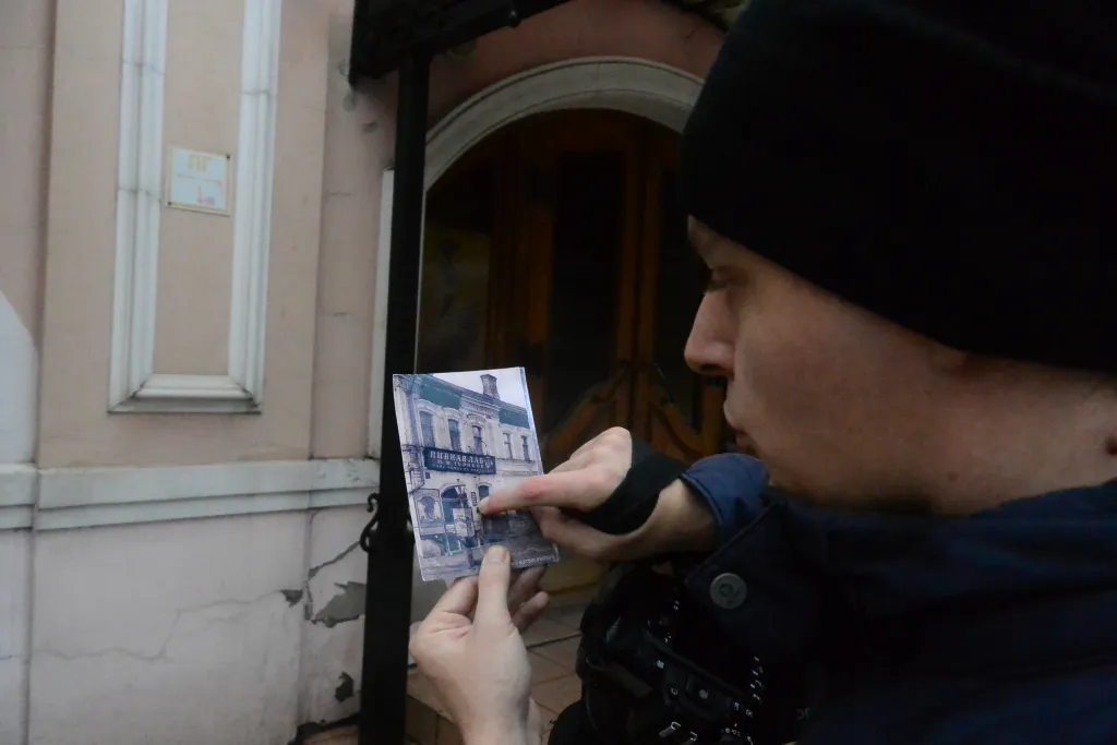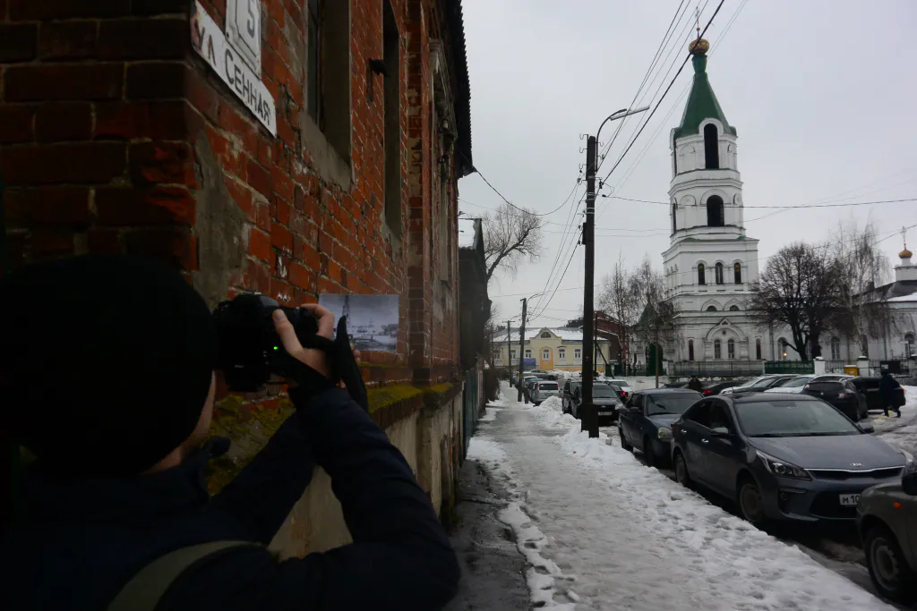 Александр достает довольно внушительную стопку фотографий, быстро ищет подходящую: на снимке Ильинская церковь и Глебовский мост (1900—1905 гг). Несколько секунд изучает изображение, внимательно оглядывается по сторонам. Выбирает ракурс. Стоп, снято.