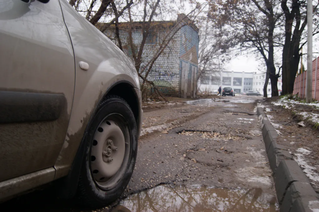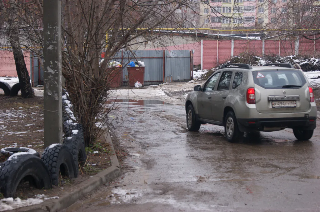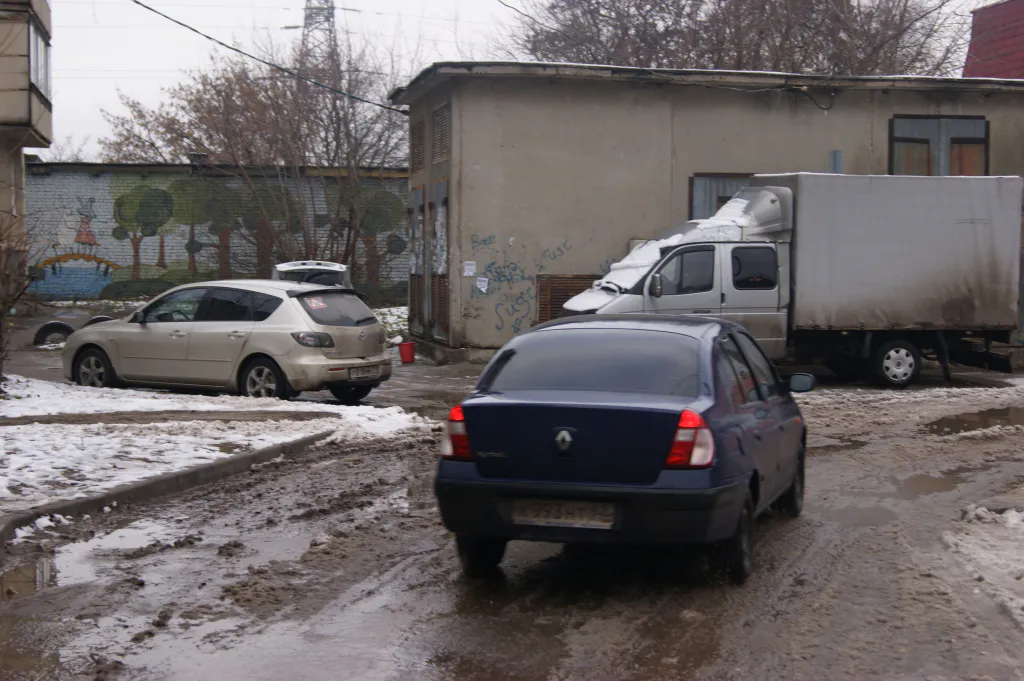 Приехали мы в обед, и уже даже в это время движение во дворе было существенно затруднено. Больше всего удивляет настырность людей – дорога здесь такого отвратительного качества, что проехать по ней в здравом уме, как казалось, никто не захочет. Но нет – уверенный, плотный поток прямо по колдобинам, глубиной с треть колеса.