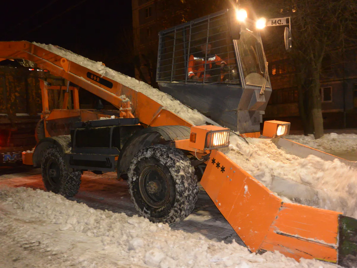 В 22:00 начинается основная работа. С помощью снегопогрузчика снег загружают в самосвал.