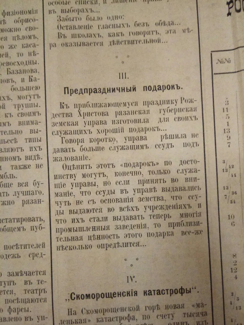 К приближающемуся празднику Рождества Христова рязанская губернская земская управа изготовила для своих служащих хороший подарок...Говоря коротко, управа решила не давать больше служащим ссуды под жалование. Оценить этот "подарок" по достоинству могут, конечно, только служащие управы, но если принять во внимание, что ссуды выдаются во всех учреждениях и что их стали выдавать теперь многие промышленные заведения, то приблизительная ценность этого подарка все же несколько определится...
