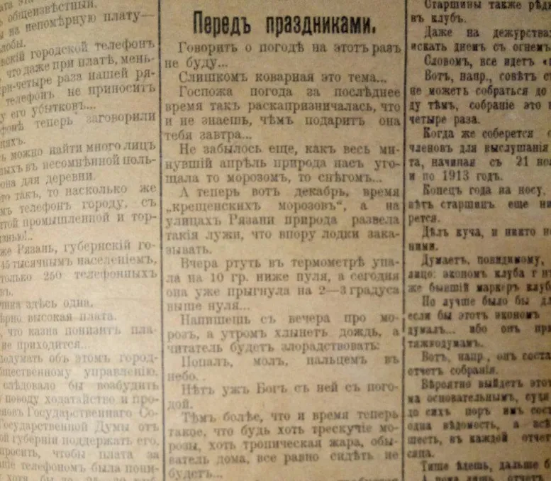 Например, теперь мы точно знаем, что и в декабре 1911 года погода не радовала рязанцев. Вот что написано в газете "Рязанская жизнь":