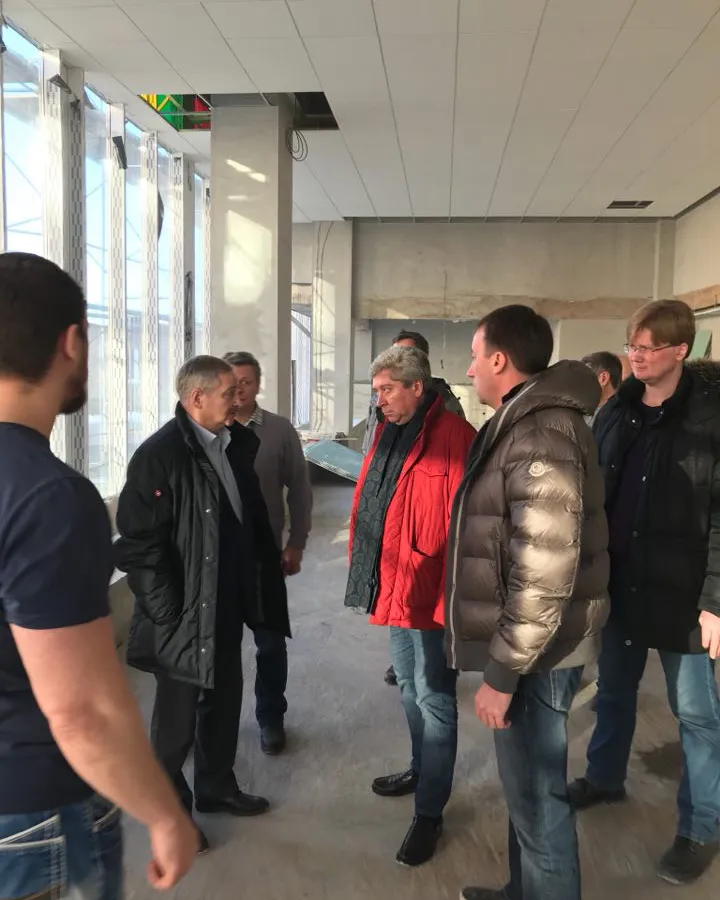 На объекте трудятся около 140 человек. В настоящее время приступают к отделке зала, ведутся работы в фойе. Полностью проложены воздуховоды, установлена система пожарной сигнализации и пожаротушения. Административно-бытовой корпус готов под чистовую отделку, – прокомментировал Дмитрий Иванов.
