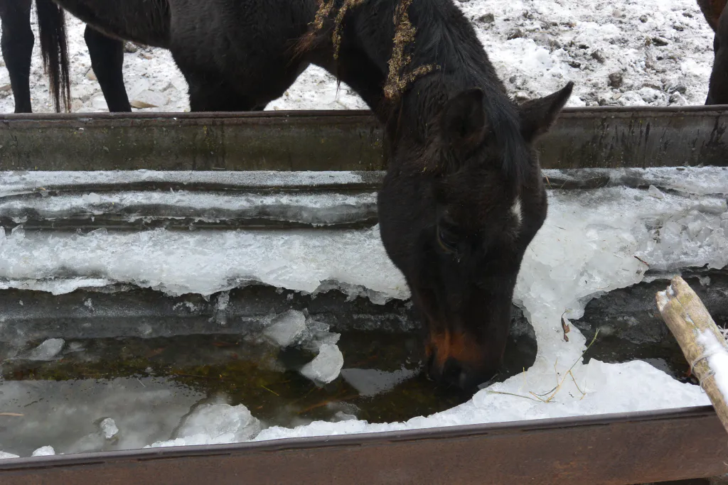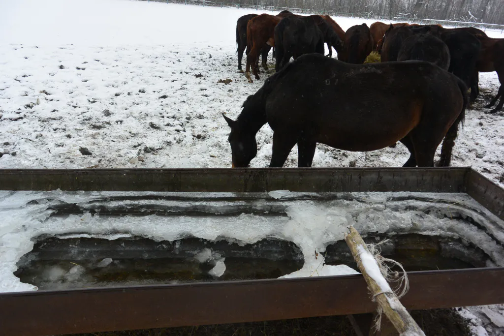 Как только о ситуации здесь начали забывать, лошадей перевели на гнилое чёрное сено и пустую солому. Сено сгнило года 3 назад – такое нельзя использовать даже в качестве подстилки, не говоря уже о корме. Животным приходится просто выколупывать эту черную субстанцию изо льда. Корм здесь, конечно, не заготавливался. Последний тракторист ушел с конезавода в апреле – делать заготовки было просто некому. Вода в единственной поилке полностью замёрзла. Местные жители предлагали старые ванны, но владельцы, видимо, слишком гордые, чтобы принимать помощь.