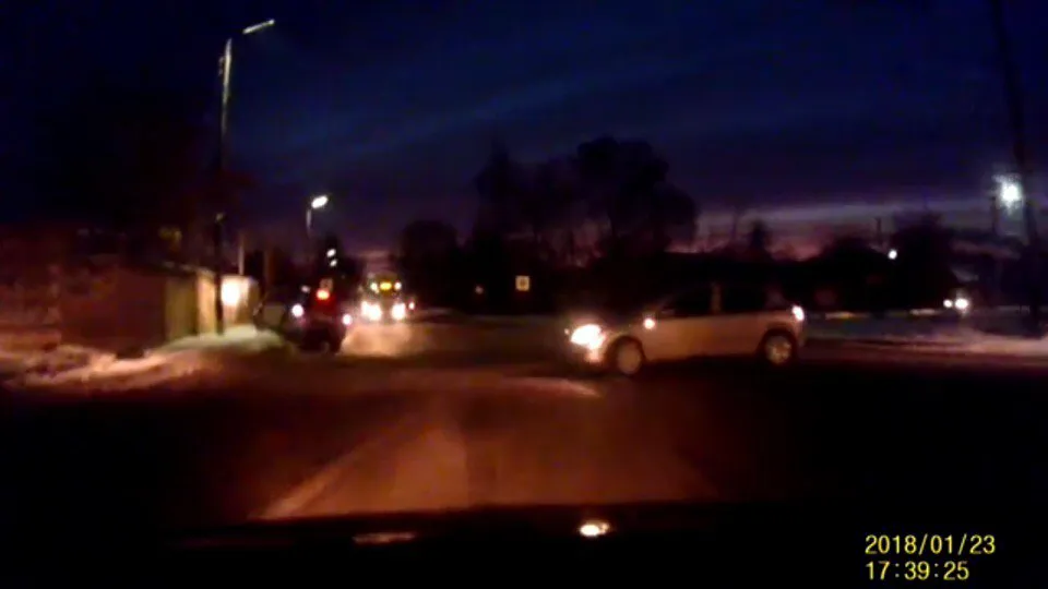 На видео водитель автомобиля попытался уйти от столкновения с иномаркой и вылетел с дороги, врезавшись в стену.