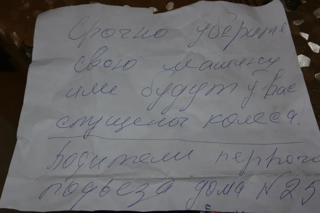 Вскоре Владимира положили в больницу. Все время, пока он был на лечении, машина стояла около подъезда, - говорит Нина Борисовна, - Уже после того, как его выписали, мы обнаружили на автомобиле записку «Срочно уберите свою машину или у вас будут спущены колеса». И подпись — водители первого подъезда дома №25. Действительно, 3 колеса были пробиты.