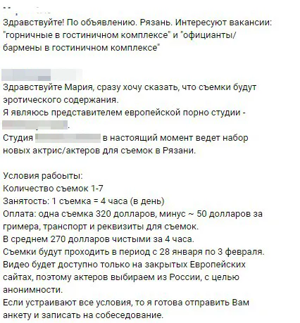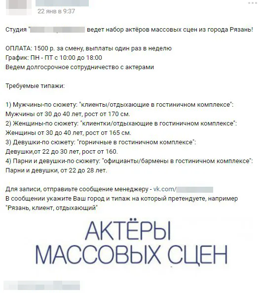 В социальной сети ВКонтакте опубликован рассказ девушки, которая обратилась по весьма необычному объявлению о вакансии. В тексте объявления сказано, что в Рязани ведется набор "актеров массовых сцен".