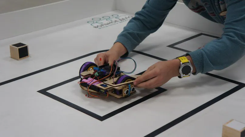 Инженерам постарше и задание было уже посложнее - они должны были собрать и запрограммировать робота, который на скорость проехать трассу и одновременно собрать груз в определенном порядке.