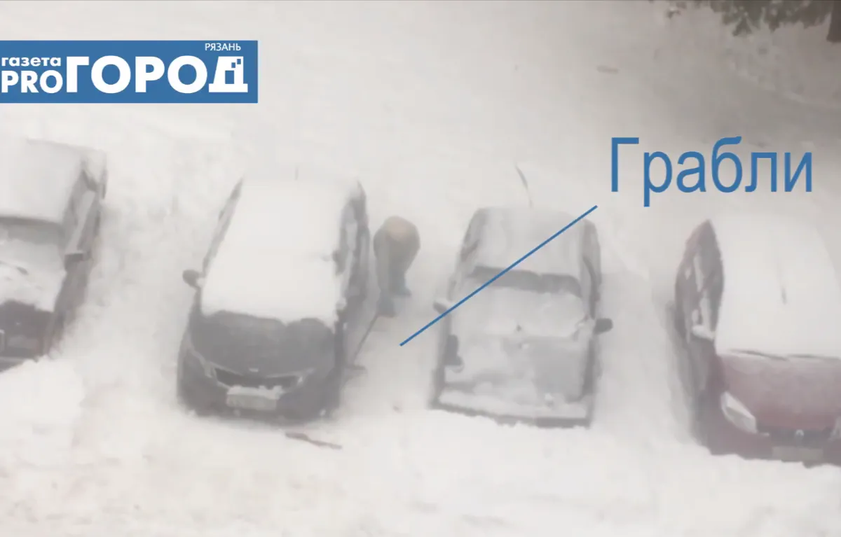 Рязанец опубликовал на Youtube видео, в котором из окна дома заснял необычную картину. Мужчина, стоя между двух машин, убирал снег граблями.