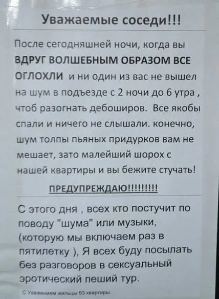 Причина конфликта понятна - по всей видимости, соседи автора этого объявления не жалеют своего времени и сил на то, чтобы приходить с жалобами на шум в квартире, но, почему-то, не захотели высказать свои претензии, когда горланила в подъезде подвыпившая молодежь.