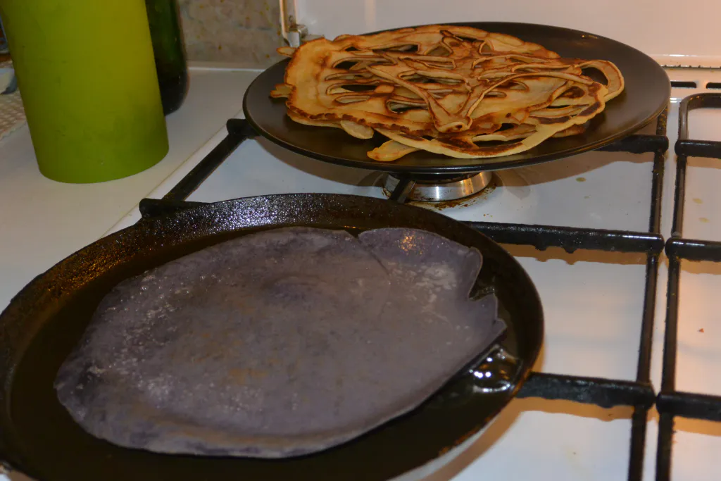 За основу для творчества были взяты 2 классических рецепта. Простые блины из пресного теста на молоке, и ржаные блины на дрожжах и воде. Последние, кстати, оказались самыми вкусными, зато тесто на молоке стало лучшим выбором для экспериментов с формой и цветом.