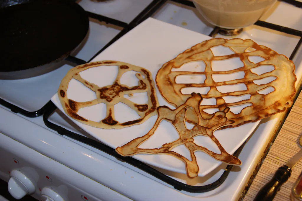 Фигурные блины делаются с помощью обычного дозатора для соусов. Результат выходит не таким, как на роликах в Youtube, но занятие увлекательное. Дозатором как карандашом можно рисовать любые контуры и получать блины ажурной формы. Главное, сделать тесто чуть гуще и усилить состав дополнительным яйцом. Печь такие блины с детьми - отличное развлечение для выходного дня.