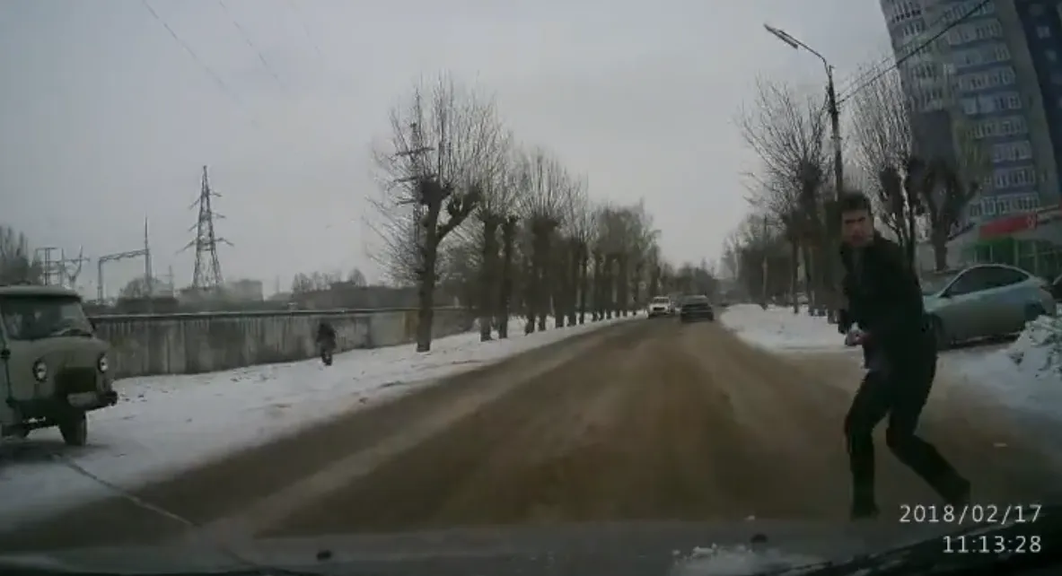 В воскресенье, 18 февраля, в группе "Подслушано у водителей Рязани" была опубликована запись, на которой видно, как неадекватный молодой человек выбегает на проезжую часть и бросается прямо под колеса машины. Инцидент произошел недалеко от остановки "Кинофабрика" в Рязани.