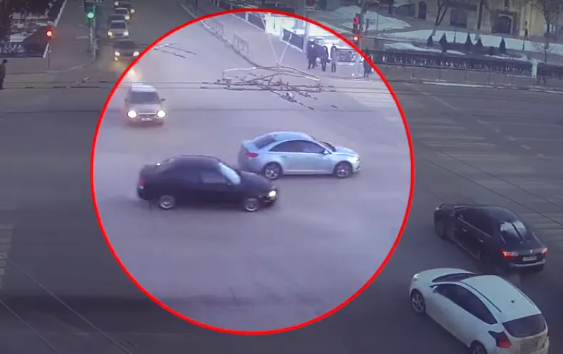 На видео автомобиль попытался проехать перекресток на красный. Машина позади него попыталась совершить обгон, но во врема маневра автомобили столкнулись.