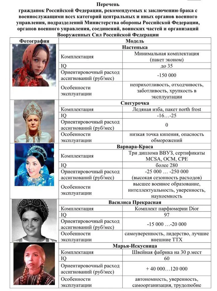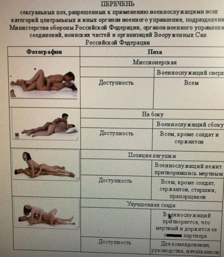 В армии - новый флешмоб, который каким-то чудом просочился в сеть. Началось все с того, что Минобороны выпустило перечень мобильных телефонов, разрешенных военнослужащим. В списке - несколько моделей с указанием главных функций и примерной стоимости (естественно, там нет ни одного смартфона). В ответ на это военнослужащие по всей стране стали составлять самые разные перечни: начиная от списка разрешенных машин и домов, и заканчивая перечнем разрешенных сексуальных поз. Получилось очень забавно.
