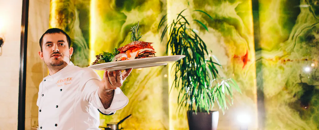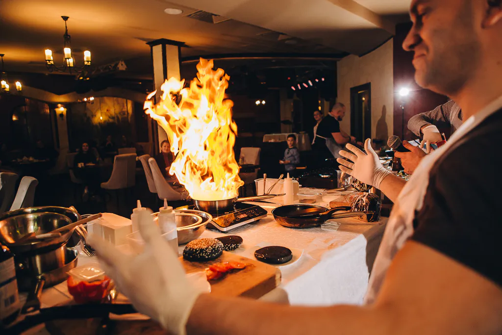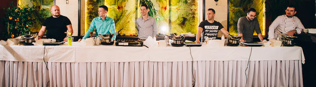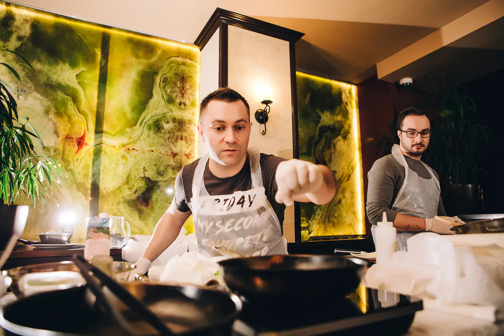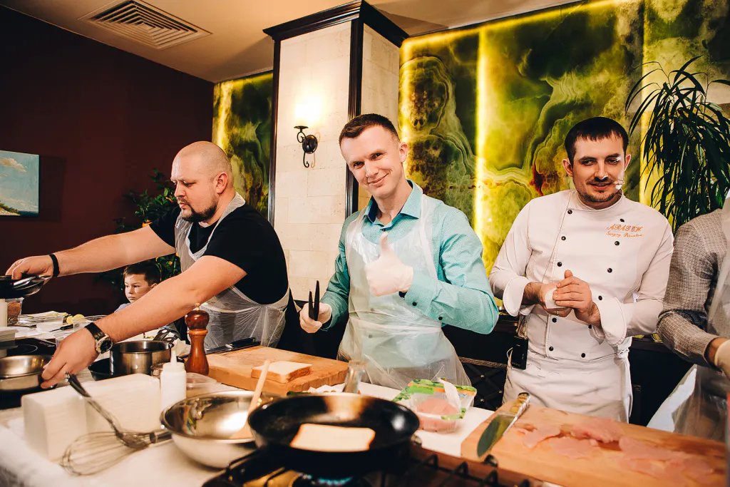 В зале «Арагона» установили столы, индукционные плиты, разложили все необходимые инструменты и конечно, обширный набор продуктов и битва началась. Как главный мастер, эксперт и арбитр выступил шеф-повар ресторана Сергей Привалов. Каждый из участников по жребию тянул название блюда, которое должен был приготовить.