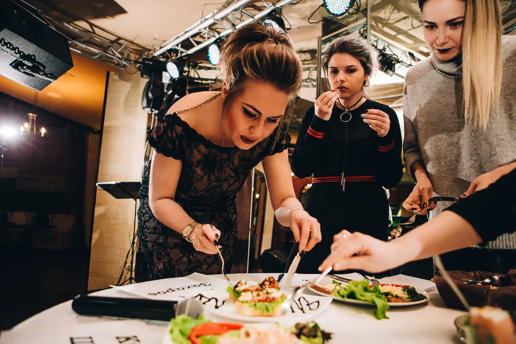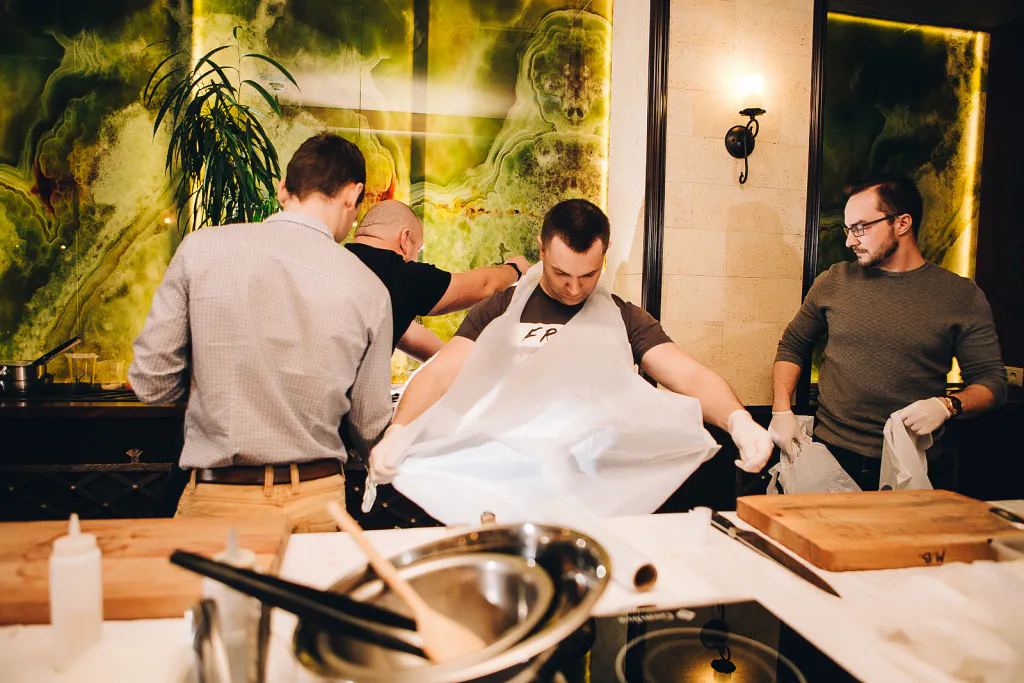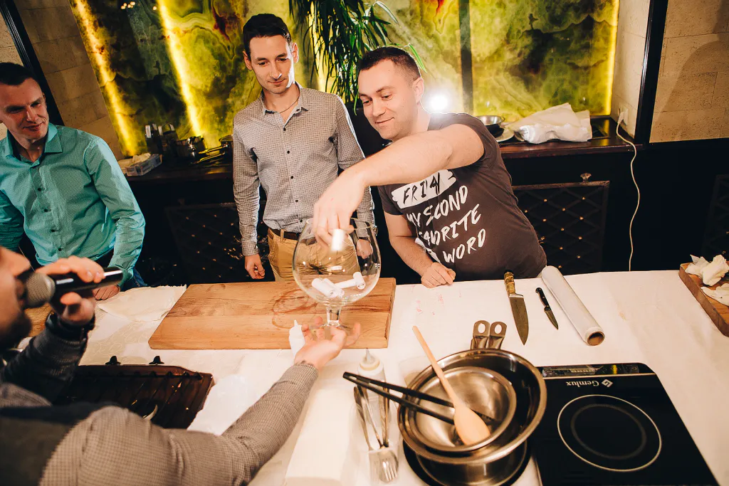 Компания для выяснения кулинарных отношений подобралась интересная. Кирилл Шишкин - ведущий, артист театра «Переход», Александр Максимов – организатор мероприятий и руководитель проекта Alex Show, Александр Митяков – артист научного шоу «Чемодан Чудес», Иван Захаров - руководитель проектов компании «Капитал 62» и Марлен Измайлов - главный редактор издания «Pro Город Рязань».