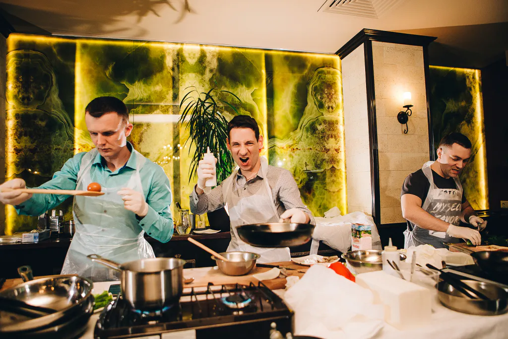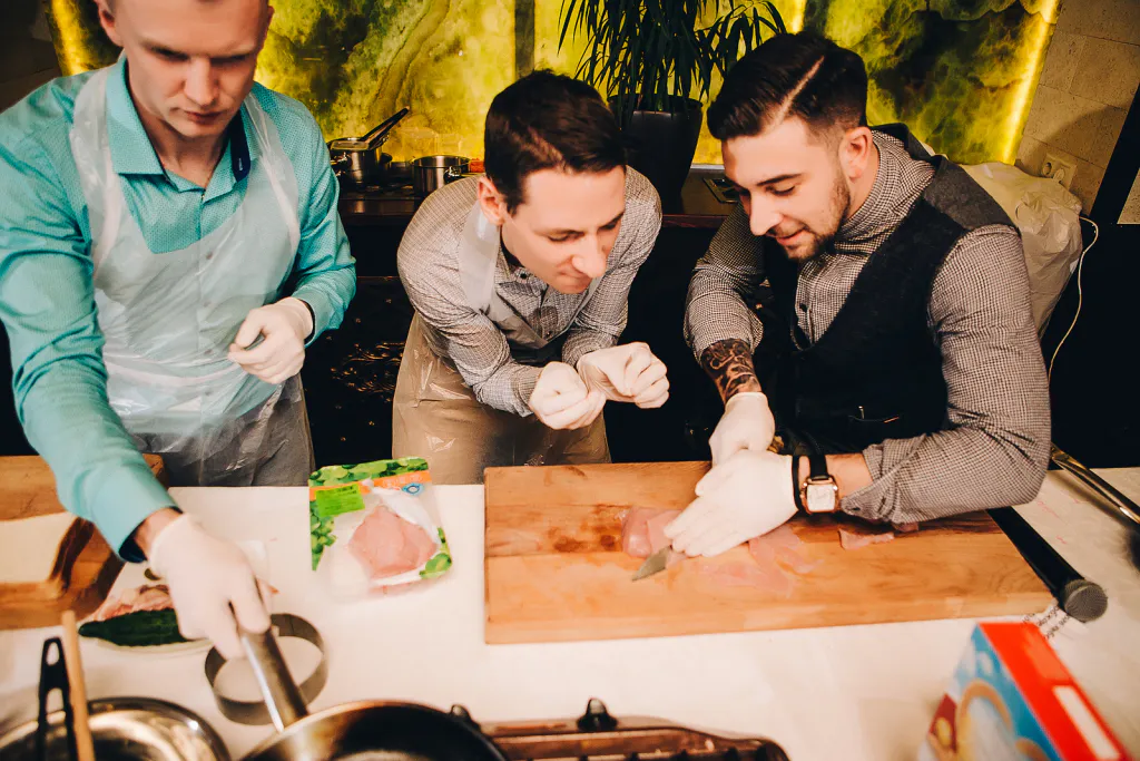 Несмотря на большое желание, каждого из участников, выиграть - на площадке конкурса сразу возникла дружеская и шутливая атмосфера. Мужчины взялись за дело и бросились резать, раскалывать, взбивать и жарить. Каждому важно было не только создать запоминающийся вкус блюда, но и пораскинуть умом над подачей. Внешний вид, особенно когда его оценивает женское жюри, важный критерий успеха. К счастью, шеф Сергей Привалов никого не оставлял в растерянности и вовремя давал экспертные советы и подсказки.