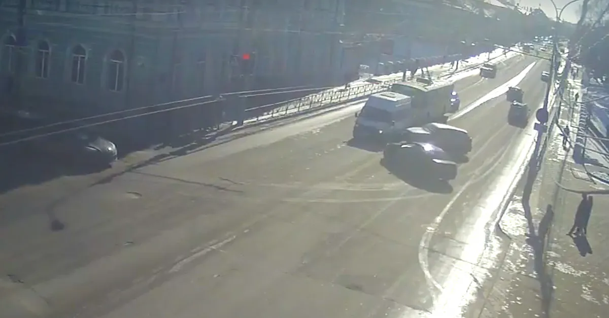 На кадрах видно, как маршрутка тормозит перед светофором, на котором горит красный свет. В поток машин, поворачивающих с улицы Почтовой на «зеленый», попытался вклиниться легковой автомобиль. В следствие этого и произошло столкновение. Уже после столкновения двух легковушек - одна из них задела микроавтобус.