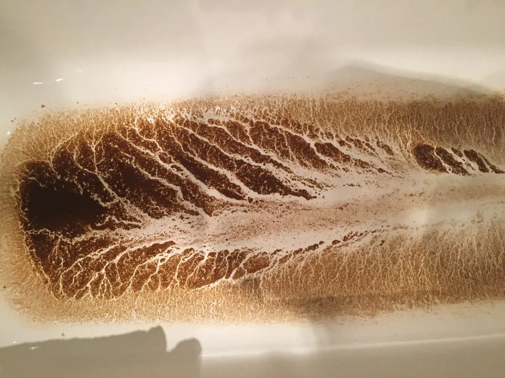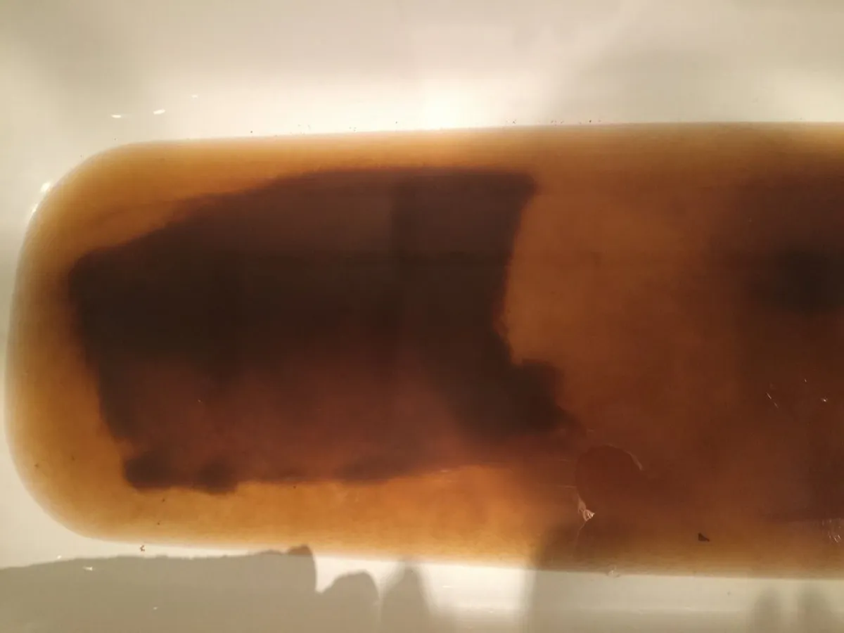 - В 12:40 включила горячую воду - и потекла такая жидкость. Периодически она становится то темнее, то чуть светлее. Всего за пару минут на ванной образовался сильный налет и образовался осадок. Эту воду явно нельзя использовать для бытовых нужд.