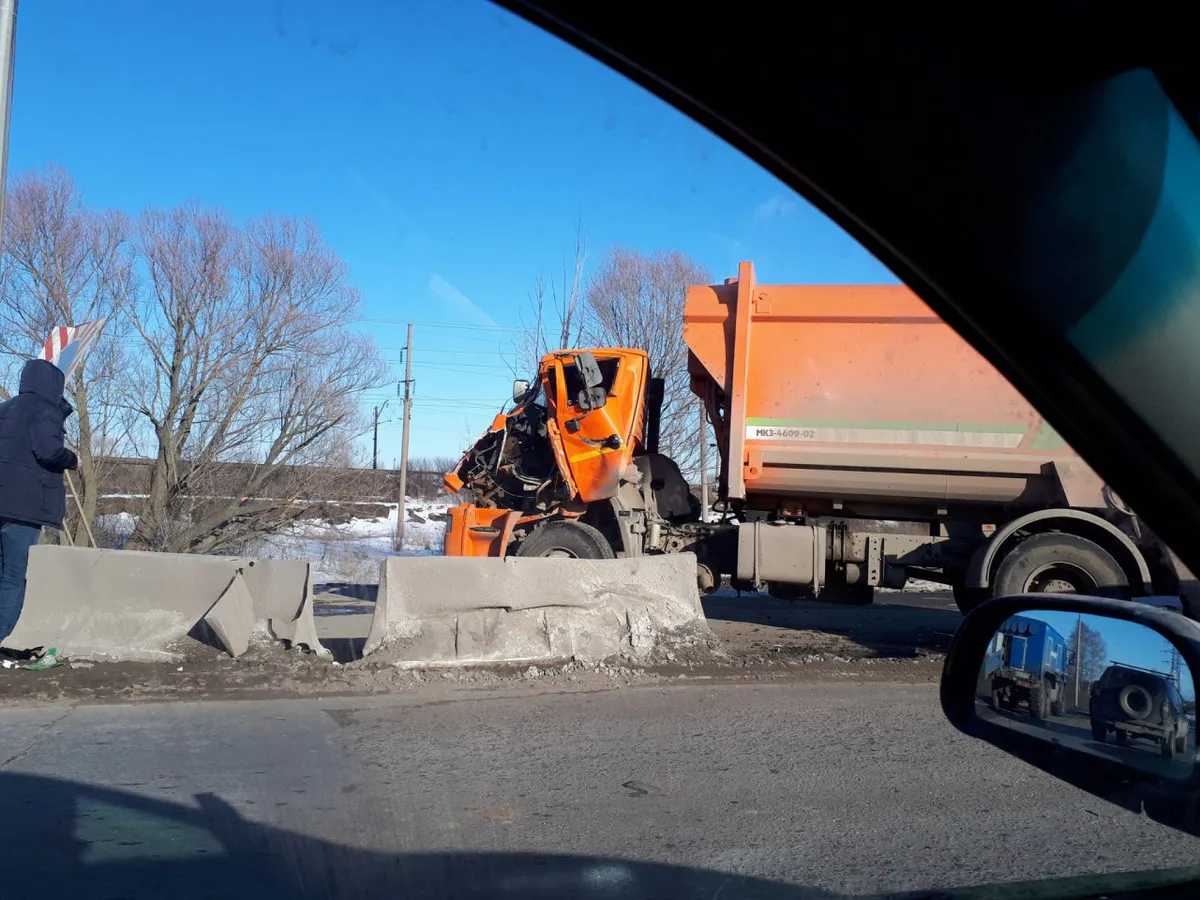 По словам отчевидцев, водитель КамАЗа не справился с управлением в врезался в бетонное ограждение на строящейся развязке на Михайлов.