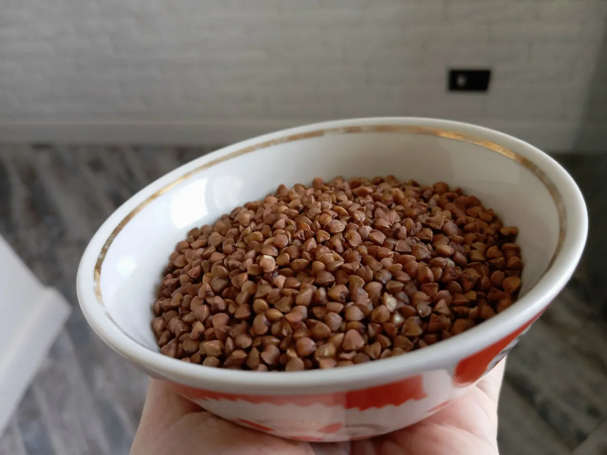 На две порции достаточно 100 граммов крупы. Это примерно половина стандартного стакана объёмом 250 мл. Гречку обязательно промываю — не потому что так положено, а потому что после промывания она варится аккуратнее и получается чище по вкусу.