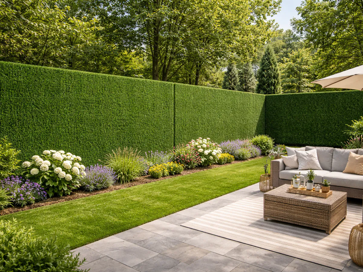 Такое ограждение остаётся зелёным круглый год. Осенью не выцветает, весной не ждёт, пока «оживёт». Полив, стрижка, удобрения — всё это остаётся в теории.