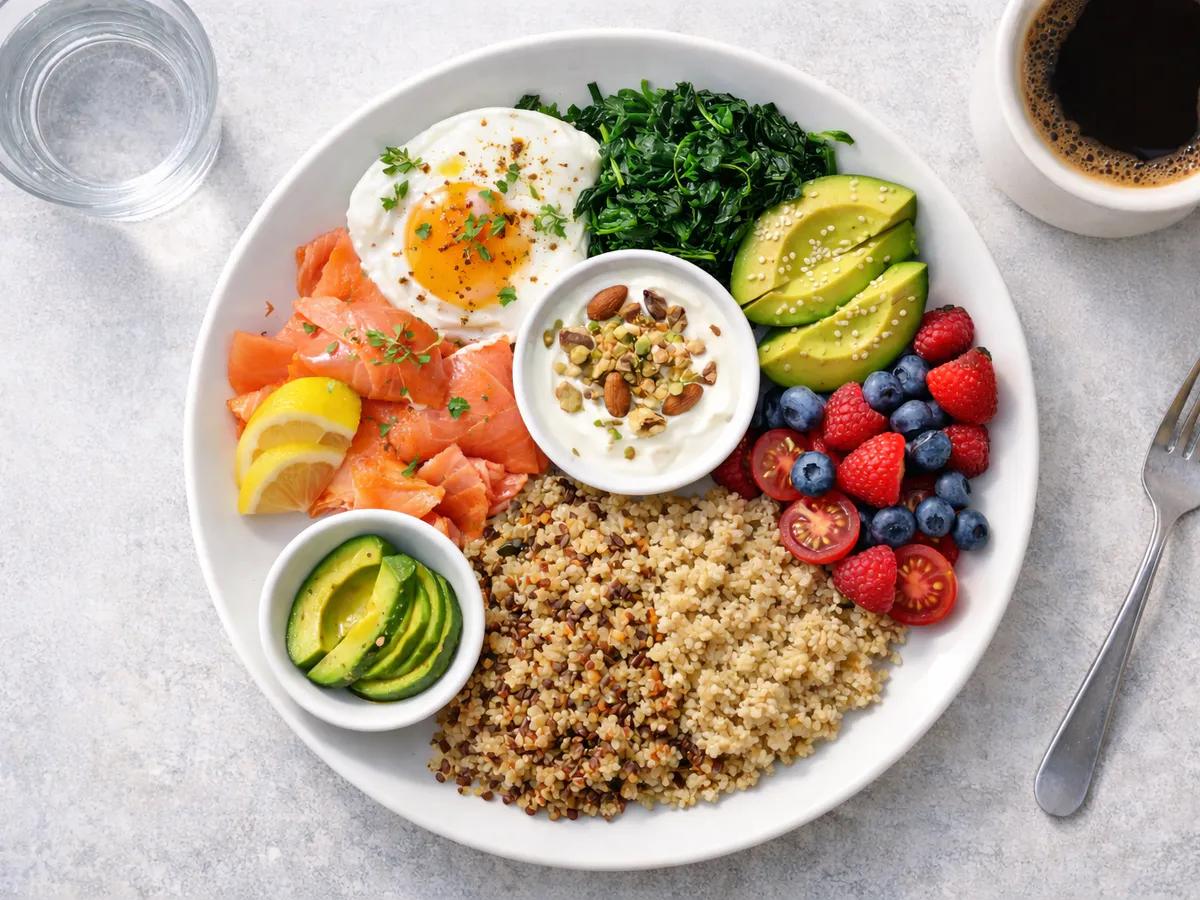 Основа завтрака — белок. Яйца, творог, сыр, йогурт или бобовые дают чувство сытости и помогают дольше сохранять энергию. К этому обычно добавляют «медленные» углеводы: овсянку, гречку, цельнозерновой хлеб, фрукты.