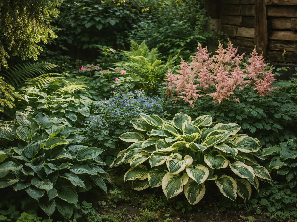 Хоста в тени чувствует себя так, будто это её территория. Листья становятся крупнее, сочнее, цвета — глубже. На солнце она капризничает, а здесь раскрывается полностью. Цветы у неё скромные, но это тот случай, когда и не нужны.