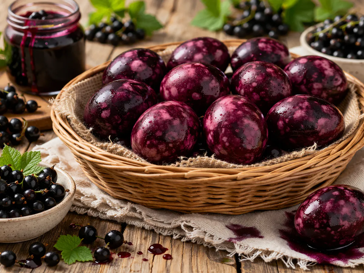 Иногда хочется, чтобы пасхальные яйца выглядели не просто аккуратно, а по-настоящему необычно. Не стандартный жёлтый или коричневый, а что-то с характером. И вот тут неожиданно работает обычная замороженная смородина. Причём результат получается не «крашеный», а будто сам проявился.